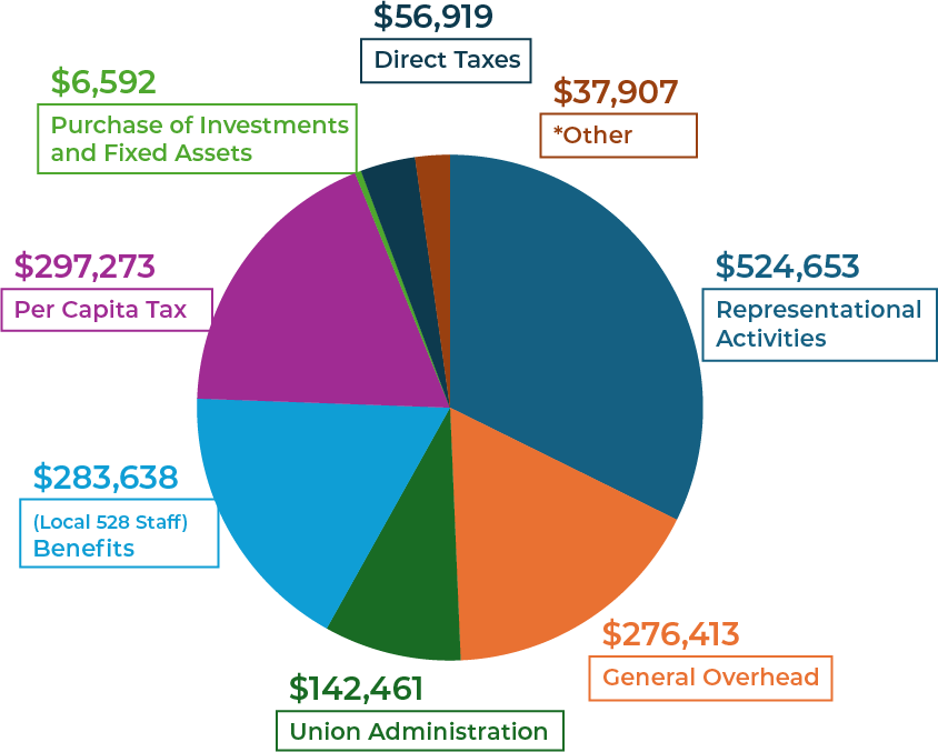The chart below describes how local 528 spent $1.6 million ($183,622 more than the union collected), including: